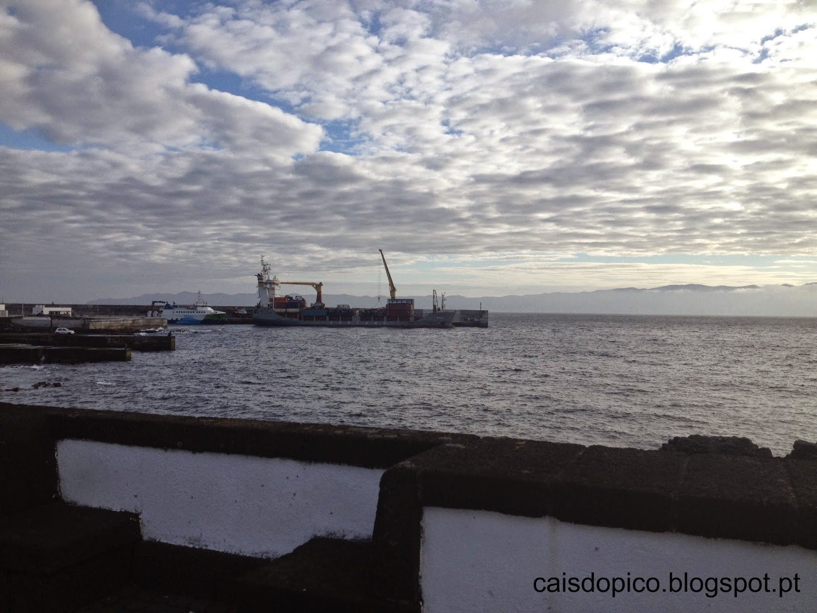 Provavelmente me dirão que o porto de São Roque do Pico, por ser o principal porto comercial da ilha montanha e onde atracam os navios porta-contentores (curiosamente o seu nome oficial é Porto do Cais do Pico, refletindo o facto de ter sido ao longo dos tempos o principal ancoradouro da ilha do Pico), não pode operar em simultâneo navios de mercadorias e de passageiros, e daí ser preterido em alguns dias. Eu refuto essa justificação, não só porque já observei essa operação simultânea no passado [ver foto no fim do post], como também no porto comercial de Velas, o qual tem o mesmo comprimento de cais acostável que o porto comercial de São Roque do Pico (110 metros, segundo a página 43 do PIT), operam em simultâneo navios de mercadorias e de passageiros.