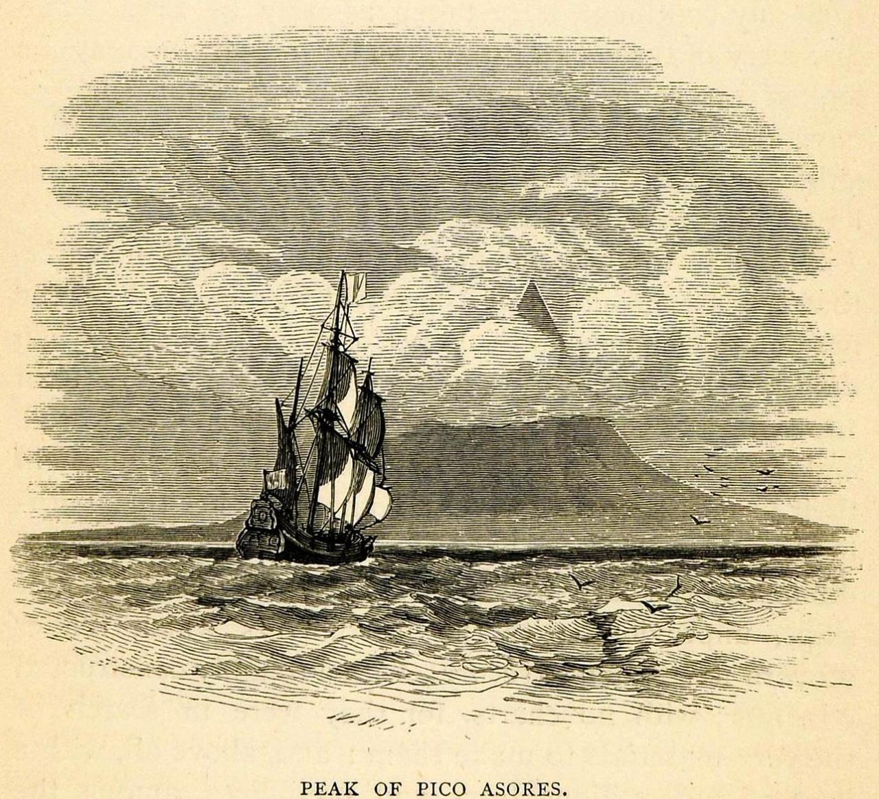 Aqui fica uma xilogravura de 1878, de autor desconhecido, ilustrando um veleiro com a ilha do Pico ao fundo [imagem extraída do siteHistória dos Açores].